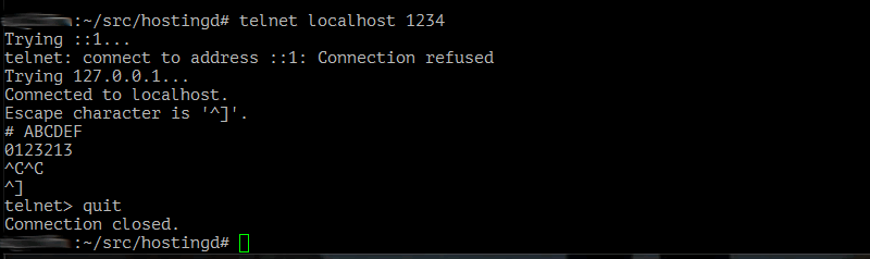 В моїх реаліях - кліентська частина (в моєму тестовому випадку - telnet) мала закінчувати сессію. І тут вилізли ті 2%, коли Ctrl+C не допомагало. Настав час розібратись як вийти з телнет - і як взагалі це дуже просто (точніше треба зупинитись, сісти та почитати) - жмем CTRL+] та далі вводимо його команди, в моєму випадку це - quit.